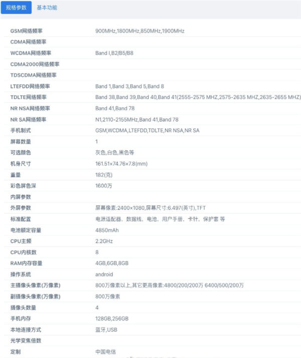 工信部数据显示,电信天翼一号配备一块6.497英寸LCD屏,分辨率为2400×1080,前置8MP镜头,后置48MP+2MP+2MP或64MP+5MP+2MP三摄,内置4850mAh容量电池,支持20W快充。