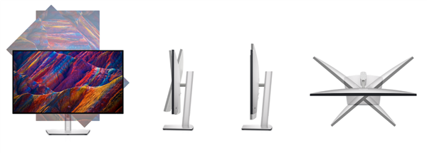 其他方面,显示器可倾斜、侧转、沿枢轴调整,采用铂金银色漆面、四边窄微边框设计。