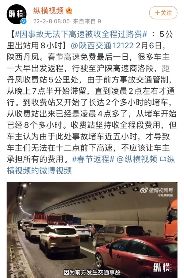 2月6日,陕西丹凤,春节高速免费最后一日,很多车主一大早出发返程,行驶至沪陕高速商洛段,距丹凤收费站5公里处,由于前方事故交通管制,从晚上7点半开始滞留,直到凌晨2点左右才通行。