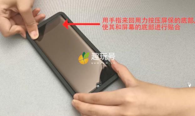 慢慢揭掉护眼屏幕守护壁纸的背胶贴膜,对准贴膜神器,轻轻放下。之后用指头来回用力按压屏幕守护壁纸的底部,使其和屏幕的底部进行贴合。