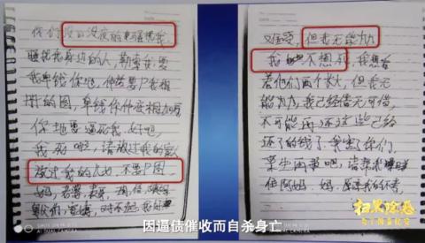 “每天每天每天每天地还(钱),我真的受不了……只想早点死,早点解脱。”最近播出的政论专题片《扫黑除恶》记录了这样一则遗言视频。