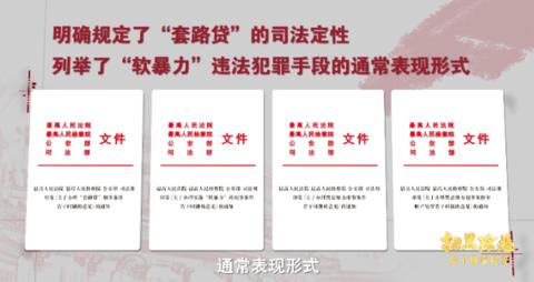 2019年4月9日,最高人民法院、最高人民检察院、公安部、司法部联合发布关于办理“套路贷”“软暴力”恶势力刑事案件和财产处置等4个法律政策意见,明确规定了套路贷的司法定性,列举“软暴力”违法犯罪手段的通常表现形式,明晰定罪量刑标准,统一法律适用尺度,破解了套路贷在法律适用上的难题,确保于法有据、有法可依。