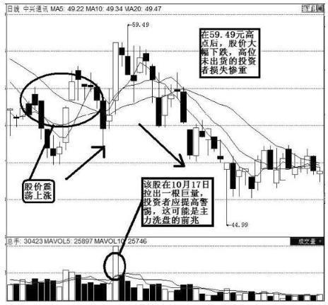 例:中兴通讯(000063)(见下图)该股2007年10月17日成交量拉出了一根巨量,尽管当日股价以长阳线收盘,但投资者仍需提高警惕,这可能是一次技术破位。但是技术破位需要确认两个“3”:时间上为连续放量下跌3天,空间上为下跌幅度超过3%。巨量后3天股价连续下跌,随后该股股价一路下行。