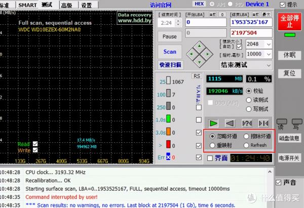 | Loop the test/repair: | 修复坏道,如果不能修复,则进行 Remap,一直重复 Remap 直到将坏道映射到功能正常的厂家保留分区(磁盘消磁处理) |