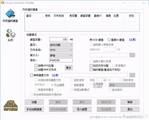 点击创建,创建前需要自己设置一个硬盘容量,当然软件默认的是128MB。实际上根据个人需求是可以设置的更大,选择上有SCSI硬盘,或者是直接IO硬盘。SCSI硬盘指的是虚拟硬盘遵循SCSI规范,可被操作系统识别为真实物理硬盘。直接IO硬盘具有比SCSI虚拟硬盘更快的访问速度,但被操作系统识别为逻辑硬盘。我的建议分配硬盘是1G至8G左右做合适。太大了实际上并不会使用硬盘占满。