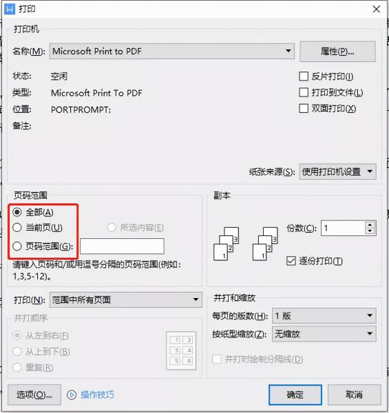 若打印全部文档,可勾选全部,若打印文档当前页,可勾选当前页。