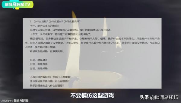 这次再出现,是为了给左央事件做一个完结。并且告诫少年和学生们,不要模仿这些游戏。即便游戏本身没有危险,心理影响也不太好。