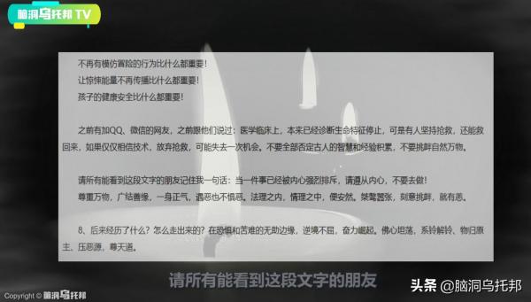 帖子中最后说,不要再有危险的模仿行为,孩子的健康安全比什么都重要,让惊悚能量不再传播比什么都重要,相信科学,坚决反对迷信。还劝诫所有人:请所有能看到这段文字的朋友记住我一句话:当一件事已经被内心强烈排斥时,请遵从内心的想法,不要去做!尊重万物,广结善缘,一身正气,遇恶也不惧恶。法理之内,情理之中,便是安然。桀骜嚣张,刻意挑衅,就有恙。