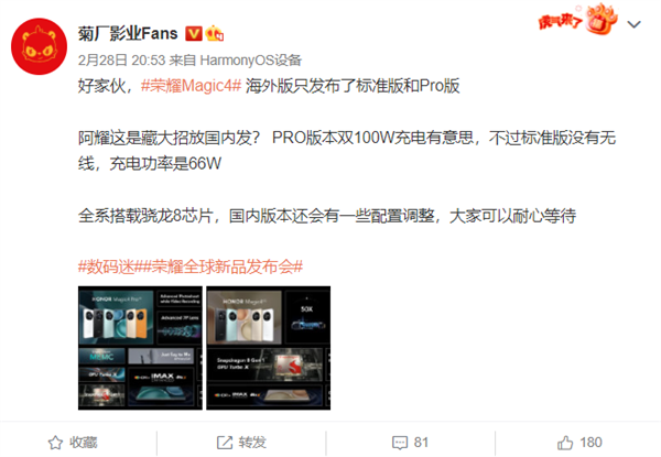 此前,有多位博主曾在微博上爆料过Magic4“超大杯”的消息,而此次全球发布会只有Magic4、Magic4 Pro两款新机。结合官方预告和赵明微博来看, 3月17日的国内发布会荣耀Magic4“超大杯”有望首发登场。