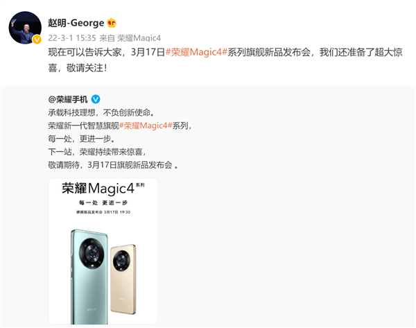 随后荣耀CEO赵明转发微博并表示:“3月17日荣耀Magic4系列旗舰新品发布会,我们还准备了超大惊喜”。不少网友纷纷留言表示:直接说超大杯呗?至臻版?等等