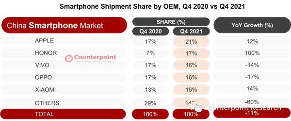 无独有偶,从知名市调机构Counterpoint Research公布的最新数据也能窥探荣耀的野心。报告显示,2021年第四季度中国智能手机出货量同比下降11%。厂商之间竞争异常激烈,荣耀出货量排名在独立后首次升至第二,安卓阵营第一,并在2022年开年持续保持强劲势头,1月周销份额达到17%,创下历史新高。